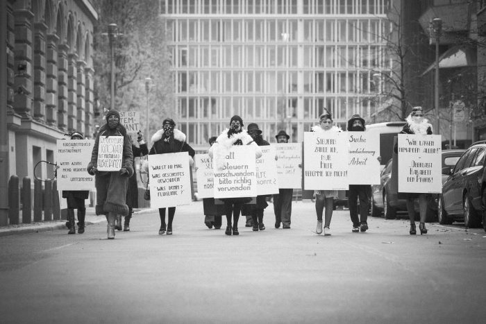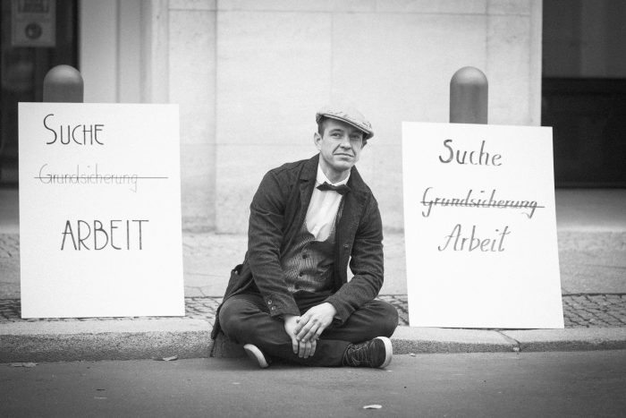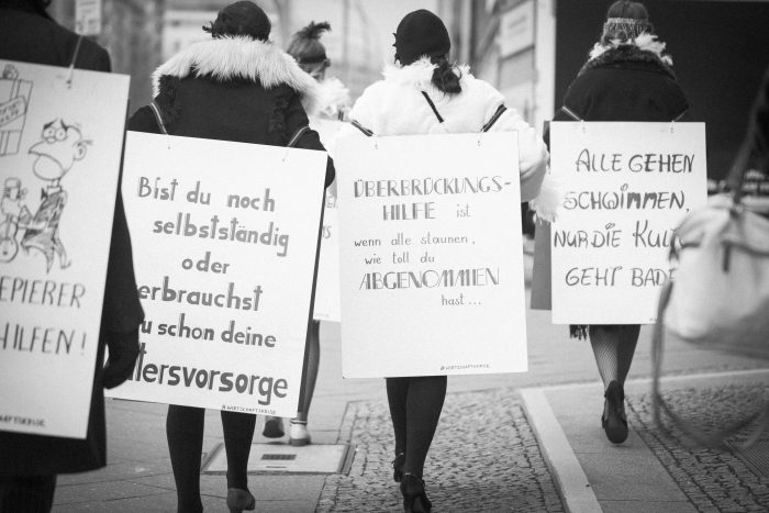 Die Kunstaktion wurde inspiriert von den ikonographischen Bildern von Arbeitern und Angestellten während der Wirtschaftskrise in den 20er/30er-Jahren, die arbeitssuchend ebenfalls mit Schildern auf der Straße auf ihre schwierge Situation aufmerksam gemacht haben. Die Aktion selbst knüpft an eine Strategie des Mikrotargeting an. Unser Ziel war es, die mangelnden Hilfen für Selbstständige als Gesprächsthema einmal auf diesem Weg in die Ministerien zu tragen.