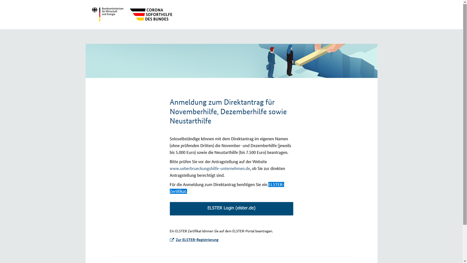 Ab sofort (Stand: 16.02.2021, 13:00 Uhr) kann die NEUSTARTHILFE beantragt werden. Der Antrag ist ausschließlich durch die Antragssteller selbst und mit einem ELSTER-Zertifikat möglich.